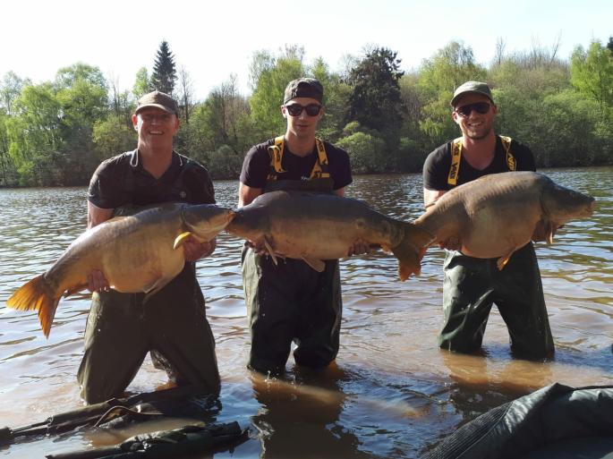 Fish are piling weight on this week we had 6 Negreloube fish out that have come out for the first time since we moved ,all have put between 10-13lb on , one fish we named the pipe fish , was severely damaged a few years ago during a drain down at negreloube the tap was fully open and it went down the pipe and ended in the outlet. It was smashed to pieces we fixed it up the best we could and left it in the stalking lake to die or recover. A few months later it was caught and was healing well so put it back in the main lake.when we moved to Charmant it was 39lb .